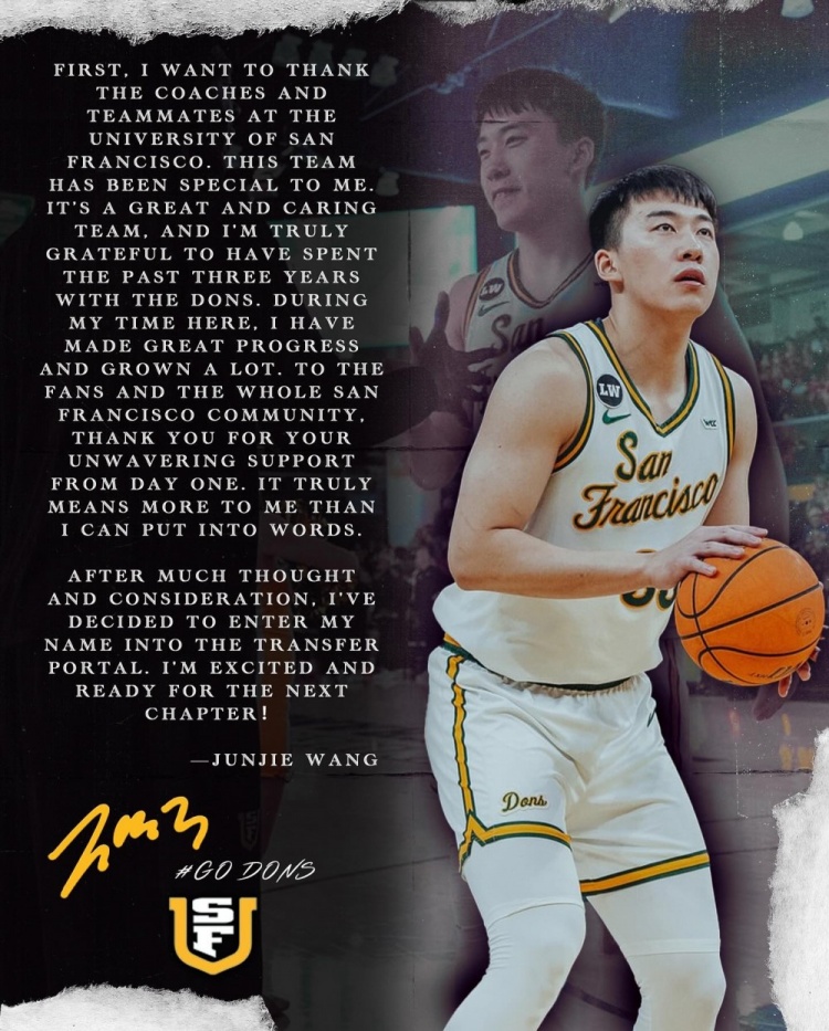 王俊杰写道:“首先,我想感谢旧金山大学的教练和队友们。这支球队对我来说意义非凡,这是一个充满关怀的伟大团队。我非常感激过去三年能够与多恩队共度时光。在这里的日子里,我取得了很大的进步,也成长了许多。对于球迷和整个旧金山社区,从第一天起你们就给予了我坚定不移的支持,这对我来说意义重大,难以言表。